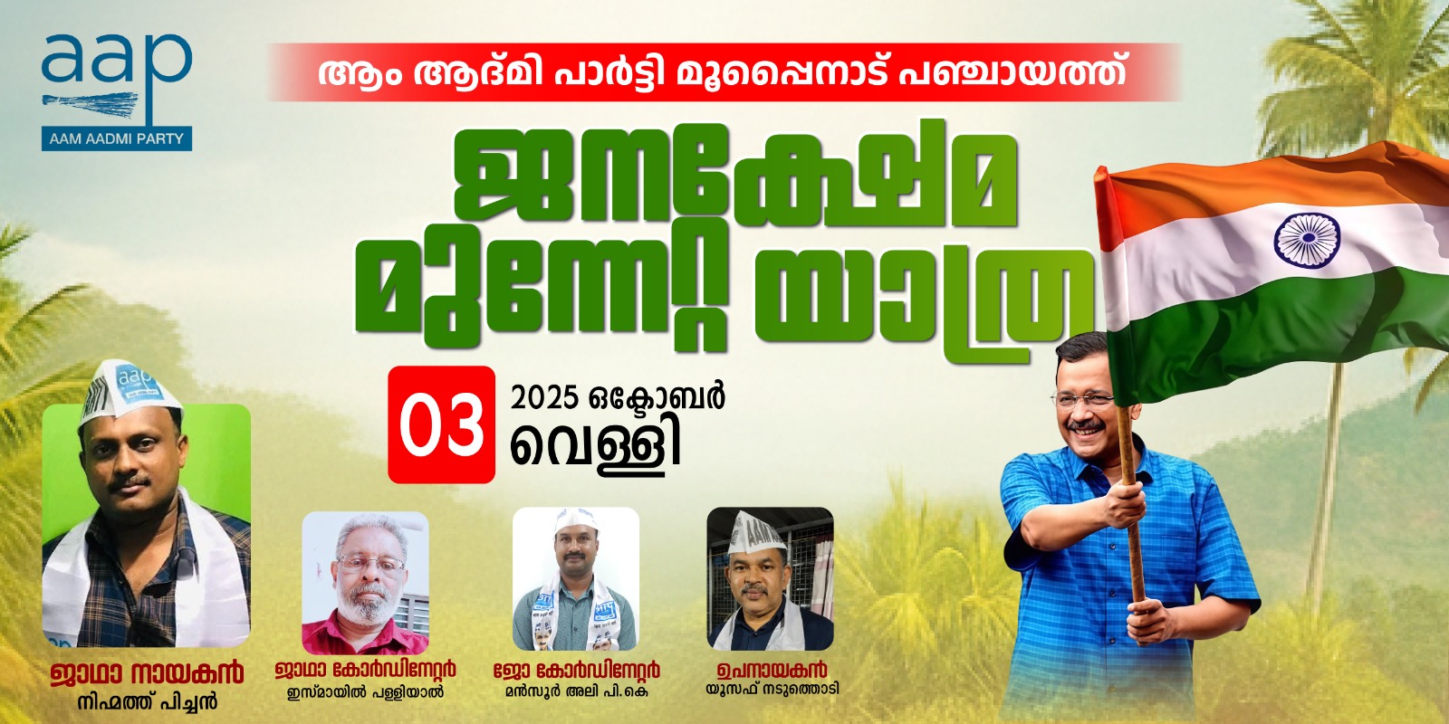 റിപ്പൺ : ആം ആദ്മി പാർട്ടി മൂപ്പൈനാട് പഞ്ചായത്ത് കമ്മിറ്റിയുടെ നേതൃത്വത്തിൽ ഒക്ടോബർ മൂന്നിന് ജനക്ഷേമ മുന്നേറ്റ യാത്ര സംഘടിപ്പിക്കും. വടുവൻചാലിൽ നിന്നും ആരംഭിക്കുന്ന യാത്ര ജില്ലാ പ്രസിഡൻ്റ് ഡോ സുരേഷ് എ. റ്റീ ഉദ്ഘാടനം ചെയ്യും. ജില്ലാ സെക്രട്ടറി പോൾസൺ അമ്പലവയൽ ജാഥ നായകൻ നിഹ്മത് പിച്ചന് പതാക കൈമാറും. പഞ്ചായത്തിൻ്റെ വിവിധ കേന്ദ്രങ്ങളിൽ പര്യടനം നടത്തി പുതുക്കാട് സമാപിക്കും. സമാപന സമ്മേളനം സംസ്ഥാന ഉപാധ്യക്ഷൻ അജി കൊളോണിയ ഉദ്ഘാടനം ചെയ്യും. ഷൗക്കത്ത് അലി ഏരോത് മുഖ്യ പ്രഭാഷണം നടത്തും. വിവിധ കേന്ദ്രങ്ങളിലായി ഗഫൂർ കോട്ടത്തറ,സൽമാൻ എൻ റിപ്പൺ, റഫീക്ക് സി. എ, ആൽബർട്ട്, അഷറഫ് പൂലാടൻ, ഈ വി തോമസ്, മുജീബ് റഹ്മാൻ എന്നിവർ സംസാരിക്കും. ജാഥ ഉപ നായകൻ യൂസഫ് നടുത്തൊടി , കോർഡിനേറ്റർ ഇസ്മായിൽ പള്ളിയാൽ, ജോ.കോർഡിനേറ്റർ മൻസൂർ അലി പി.കെ എന്നിവർ നേതൃത്വം നൽകും.