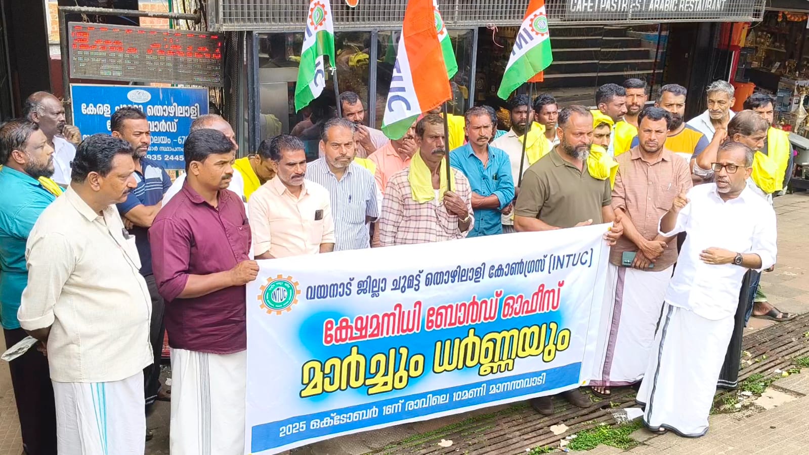 മാനന്തവാടി-ചുമട്ടു തൊഴിലാളികളുടെ വിവിധ ആവശ്യങ്ങൾ ഉന്നയിച്ച് ഐഎൻടിയുസി ചുമട്ടുതൊഴിലാളി ഫെഡറേഷൻ മാനന്തവാടി താലൂക്ക് കമ്മിറ്റിയുടെ നേതൃത്വത്തിൽ ക്ഷേമനിധി ഓഫീസിലേക്ക് മാർച്ചും ധർണയും സംഘടിപ്പിച്ചു.ധർണാ സമരം ക്ഷേമനിധി സബ് കമ്മിറ്റി മെമ്പർ ടി എ റെജി ഉദ്ഘാടനം ചെയ്തു.ചുമട്ട് തൊഴിലാളികളെ സംബന്ധിച്ച നിയമങ്ങൾ കാലോചിതമായി പരിഷ്കരിക്കണമെന്നും വിദ്യാഭ്യാസം,മരണാനന്തര ചിലവുകൾ,വിവാഹ ചെലവുകൾ തുടങ്ങിയ ആനുകൂല്യങ്ങൾ യഥാസമയം വിതരണം ചെയ്യണമെന്നും ധർണ ഉദ്ഘാടനം ചെയ്തുകൊണ്ട് അദ്ദേഹം പറഞ്ഞു.ക്ഷേമനിധിയിൽ ആനുകൂല്യങ്ങൾ വർധിപ്പിച്ചും തൊഴിൽ സുരക്ഷ ഉറപ്പുവരുത്തുന്നതിനും ആവശ്യമായ നടപടികൾ സർക്കാർ സ്വീകരിക്കണം.ഐഎൻടിയുസി മേഖലാ പ്രസിഡണ്ട് കെ.വി.ഷിനോജ് അധ്യക്ഷത വഹിച്ചു.എം പി ശശികുമാർ,പി.ബി.മൊയ്തു,സി.ജെ.അലക്സ്,സാബു പൊന്നിയിൽ,പടകൂട്ടിൽ ജോർജ്,കെ.ബി.വൈശാഖ്,ടി.കെ.മൊയ്തീൻകുട്ടി പ്രസംഗിച്ചു.