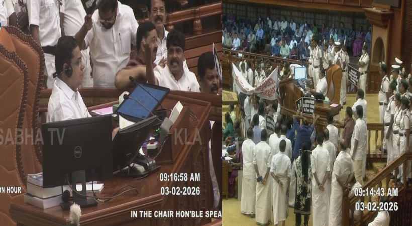 നിയമസഭയിൽ ഇന്നും പ്രതിപക്ഷ പ്രതിഷേധം. ശബരിമല സ്വർണക്കൊള്ള ഉന്നയിച്ചാണ് പ്രതിപക്ഷം പ്രതിഷേധിക്കുന്നത്. പ്ലക്കാർഡുകളുമായി സഭയുടെ നടുത്തളത്തിൽ ഇറങ്ങി നിന്നാണ് പ്രതിഷേധം നടത്തുന്നത്. സ്പീക്കർ എ എൻ ഷംസീറിന്റെ മുഖം മറച്ചു കൊണ്ട് ബാനർ വലിച്ചുയർത്തുകയും ചെയ്തു. സ്വർണം കട്ടത് ആരപ്പാ സഖാക്കളാണെ അയ്യപ്പ എന്നെഴുതിയ ബാനറാണ് പ്രതിപക്ഷം ഉയർത്തിയത്. പ്രതിഷേധത്തിനിടയിലും സഭയിൽ ചോദ്യോത്തരവേള പുരോഗമിക്കുകയാണ്.